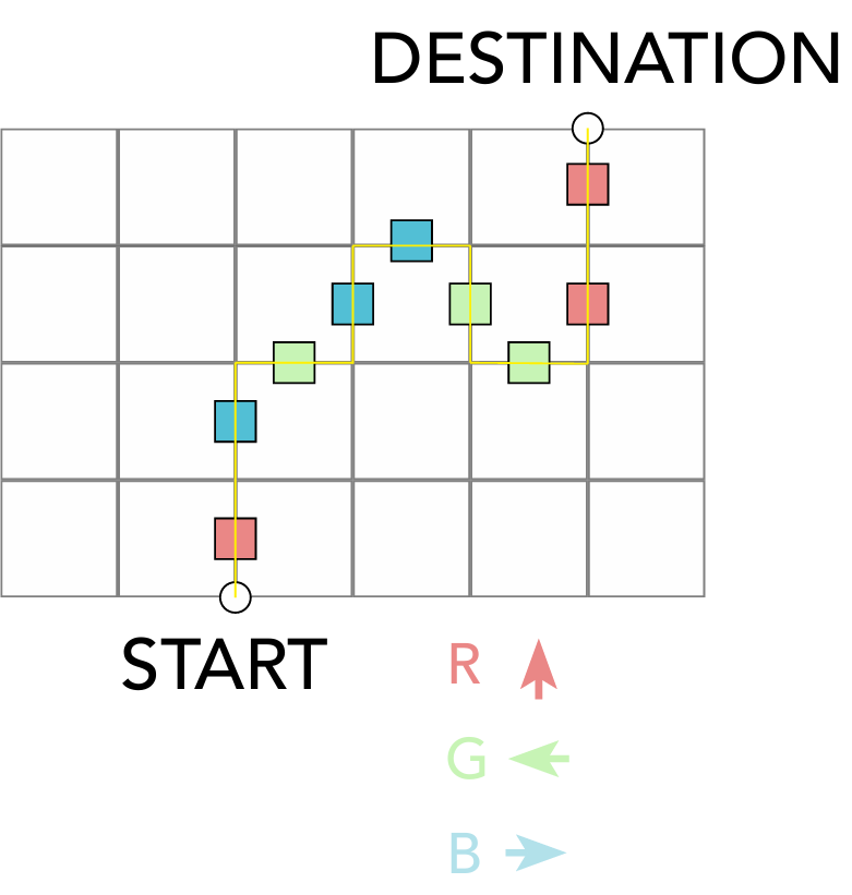 Each color panel indicates a direction. Red for straight, blue for right turn, and green for left turn.